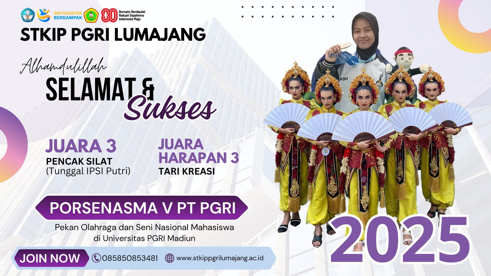 Gelaran PORSENASMA V sukses di gelar di Madiun selama tujuh hari, dengan Universitas PGRI Madiun sebagai tuan rumah. Kegiatan tersebut diikuti oleh hampir seluruh perguruan tinggi PGRI di seluruh Indonesia. Berbagai cabang olahraga dan seni dipertandingkan. Total sebanyak 26 cabang olahraga dan seni, yang diikuti oleh 1.903 atlet dari 38 universitas PGRI di seluruh Indonesia. Dalam kegatan ini STKIP PGRI Lumajang mengirimkan sebanyak 22 atlet yang terdiri dari cabor bulu tangkis, catur, pencak silat, tari kreasi, nyanyi, e-sport, dan PKM. Dalam kegiatan tersebut, STKIP PGRI Lumajang berhasil menyabet medali perunggu pada cabang olahraga pencak silat (tunggal IPSI putri), yang diwakili oleh mahasiswa program studi Pendidikan Ekonomi atas nama Nur Kholifah Hidayati. Tidak hanya itu, tim tari kreasi STKIP PGRI Lumajnag juga berhasil meraih juara harapan 3 pada tangkai seni tari kreasi. Gelaran porsenasma berakhir pada tanggal 9 Agustus 2025, yang ditutup langsung oleh Ketua Umum PB PGRI, Ibu Prof. Dr. Unifah Rosyidi, M.Pd.