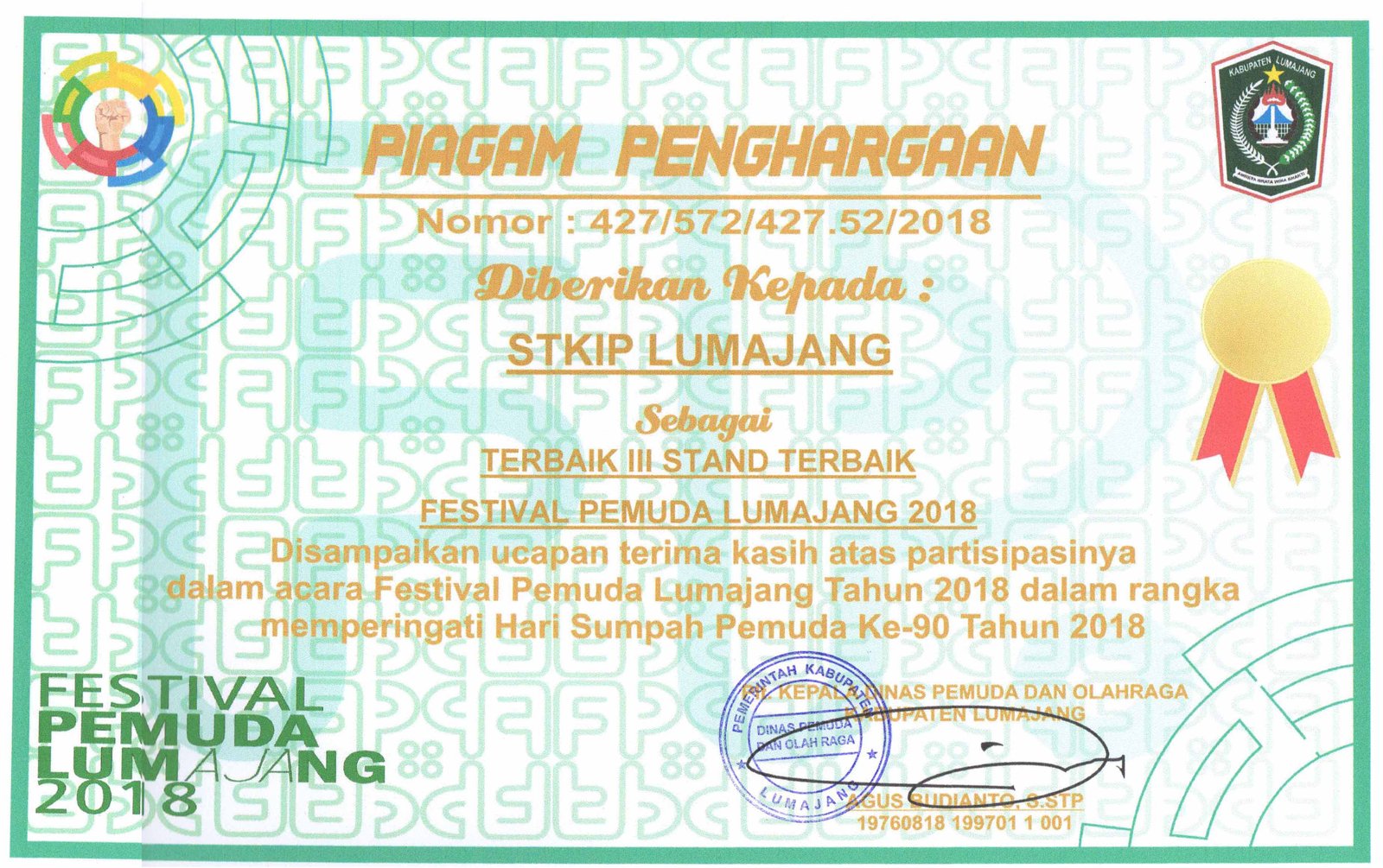 STKIP PGRI LUMAJANG memperoleh piagam penghargaan terbaik III stand terbaik festival pemuda Lumajang 2018